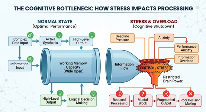 To understand why we “freeze” under pressure, we have to look at the hardware of the human brain. Cognitive Load Theory (CLT), first formulated by John Sweller in the 1980s, is based on the idea that our working memory has a strictly limited capacity.